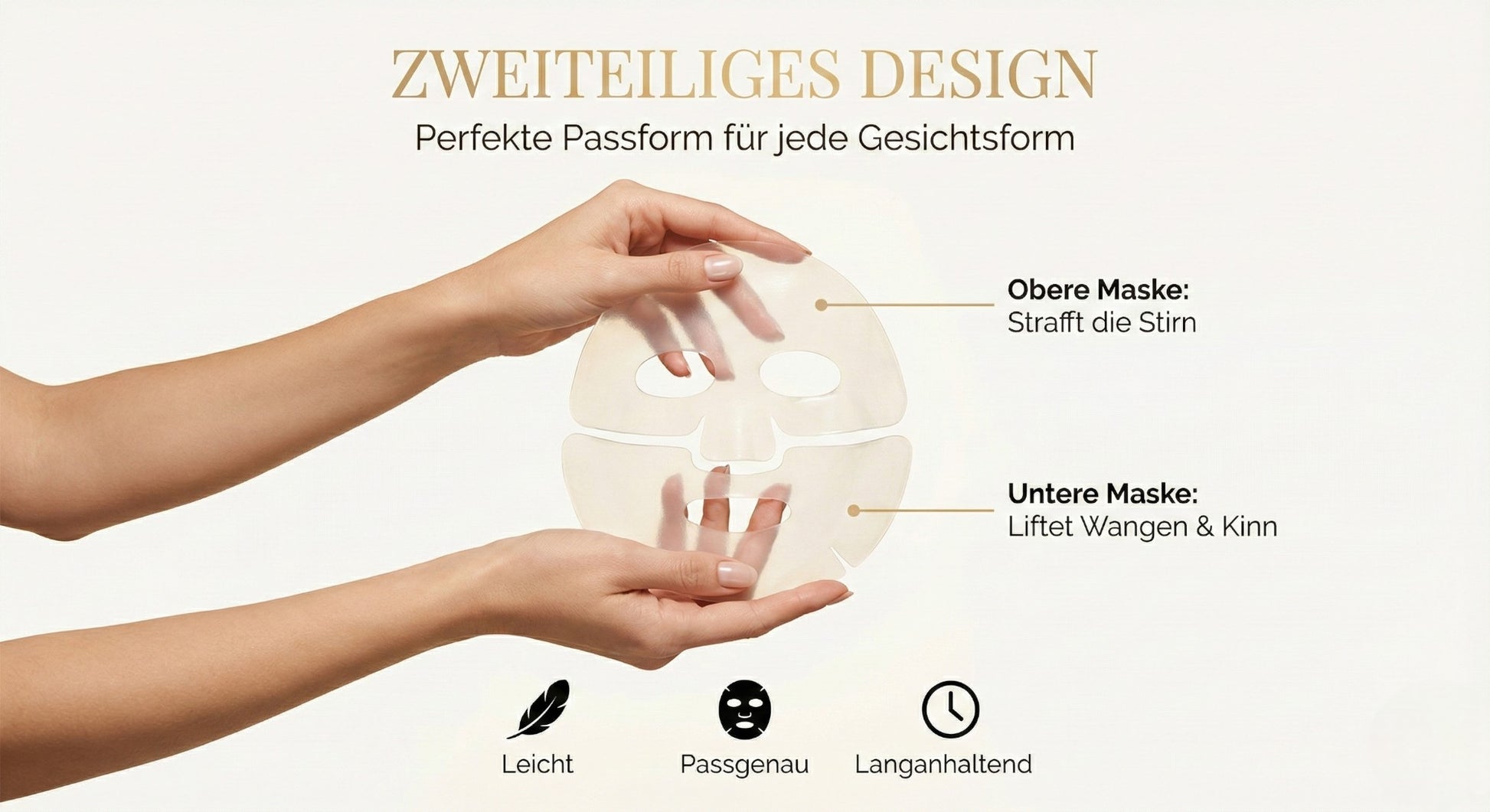Nach 1-2 Stunden ist das Kollagen vollständig eingezogen — Sie sehen es mit eigenen Augen. Die Maske verschwindet, Ihre Falten auch.